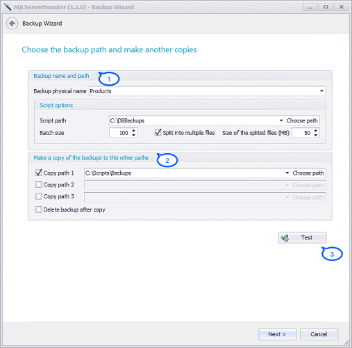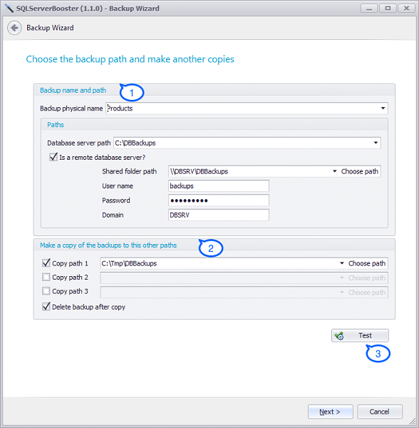 - Is a remote database server?: In case the machine where SQLServerBooster it's installed and MS SQL Server it's installed is not the same. It has to specify a UNC path to be able to compress (in case this option was selected) and has access to copy to the other paths