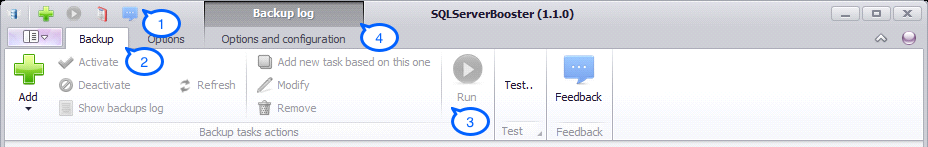 The SQLServerBooster's ribbon tabs are located at the top of the main window and provide all the features available within SQLServerBooster in a categorized fashion. The ribbon tabs parts are: