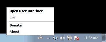 Doing a Righ-click over the SQLServerBooster's logo try icon this Context Menu appears. It is possible to "Open the User Interface", "Exit", "Donate" or "About".