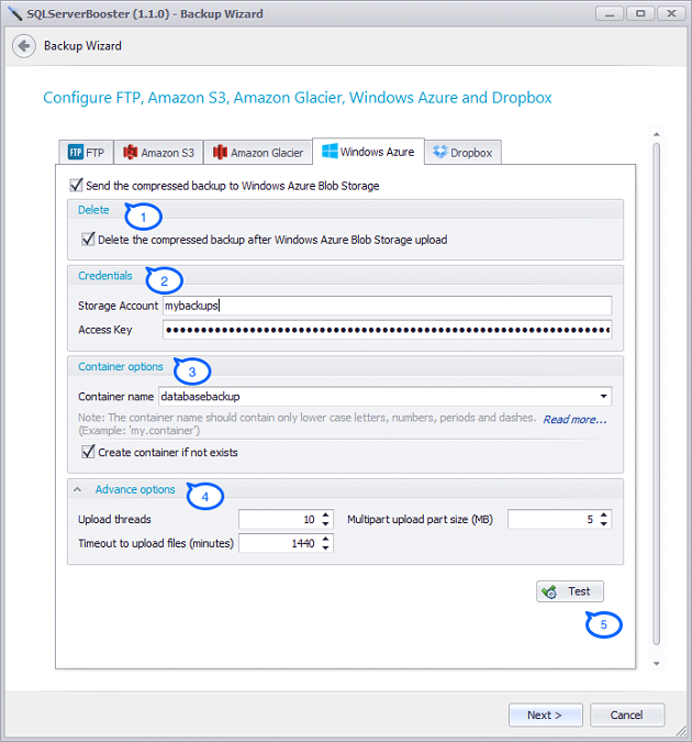 - Upload threads: This property determines how many active threads will be used to upload the backup file(s)