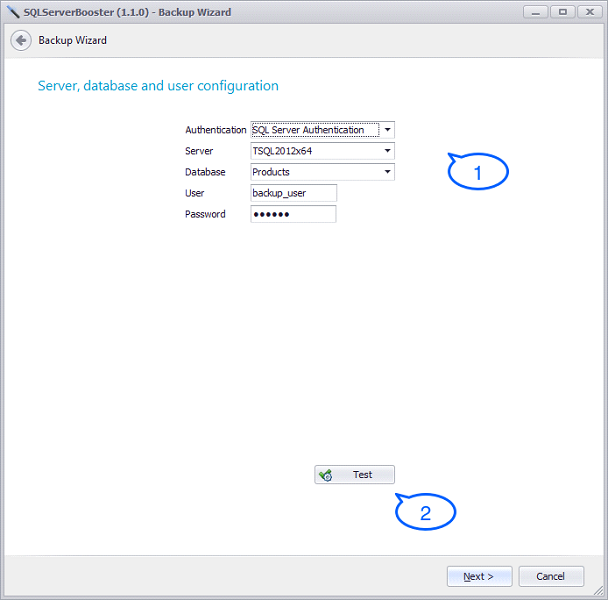* Note: If the machine where SQLServerBooster it's installed and MS SQL Server it's installed are different, the authentication method has to be "SQL Server Authentication", otherwise the SQLServerBooster Windows Service (SQLSBService.exe) will generate an error saying that because permissions was impossible to create the backup.
